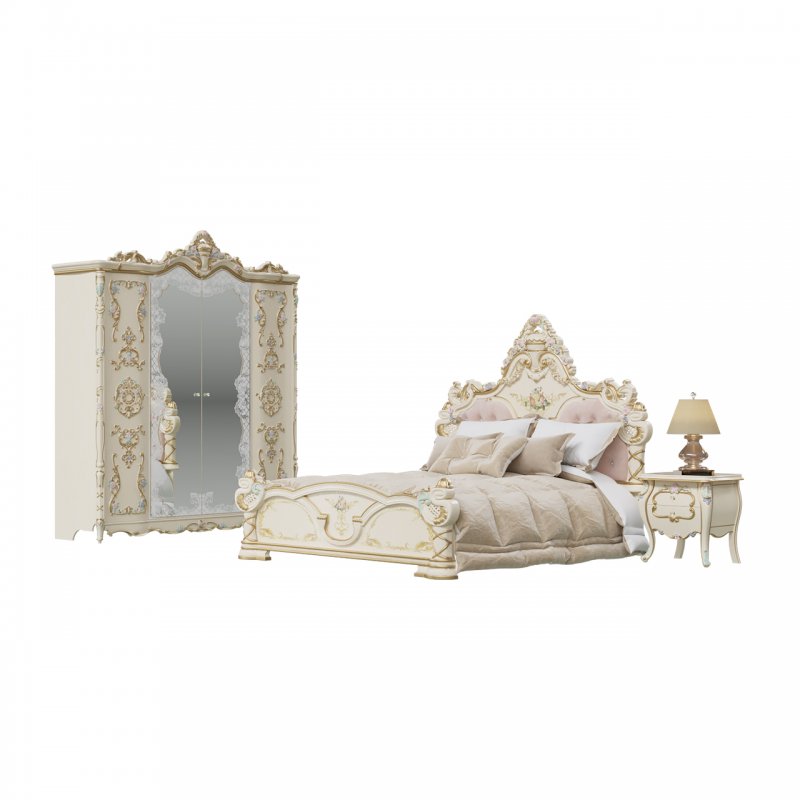 Спальня Людовик в цвете - Слоновая кость кракелюр (искусственное старение) с уникальной технологией 5-ти слойного покрытия итальянскими лаками, ручная роспись резных элементов в стиле Барокко.