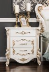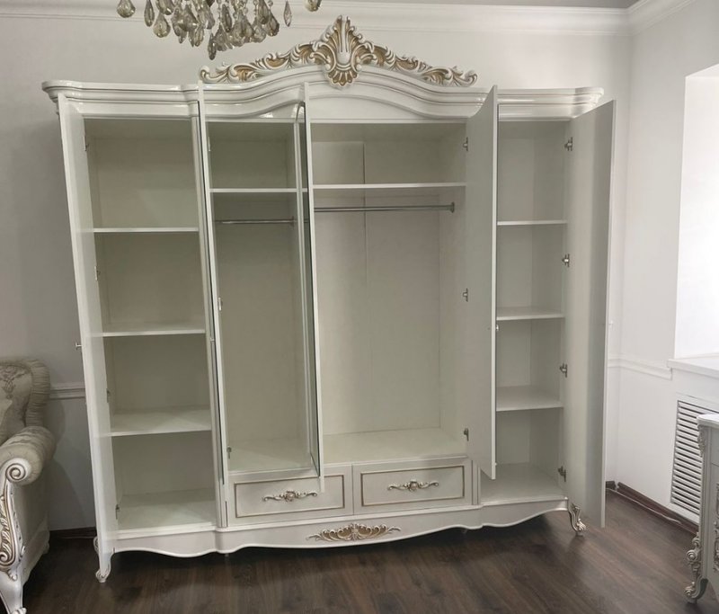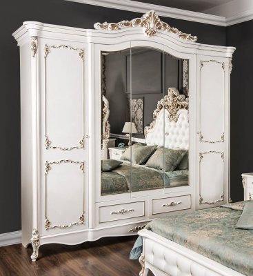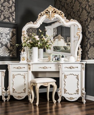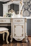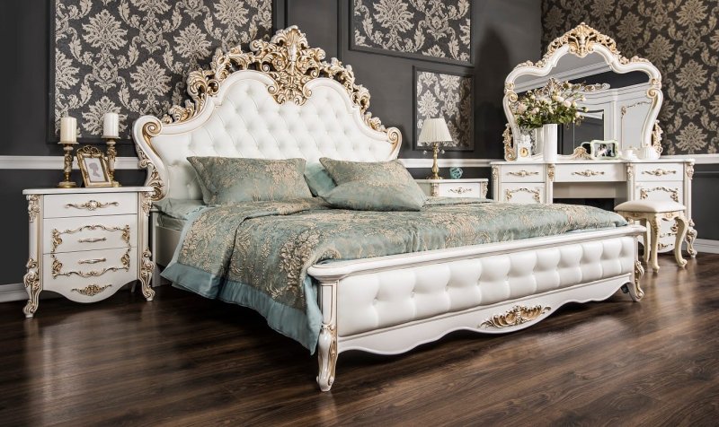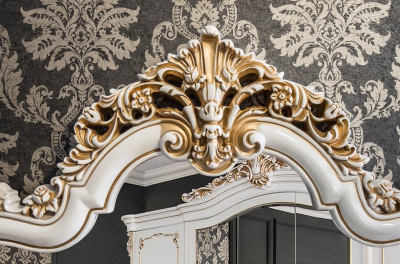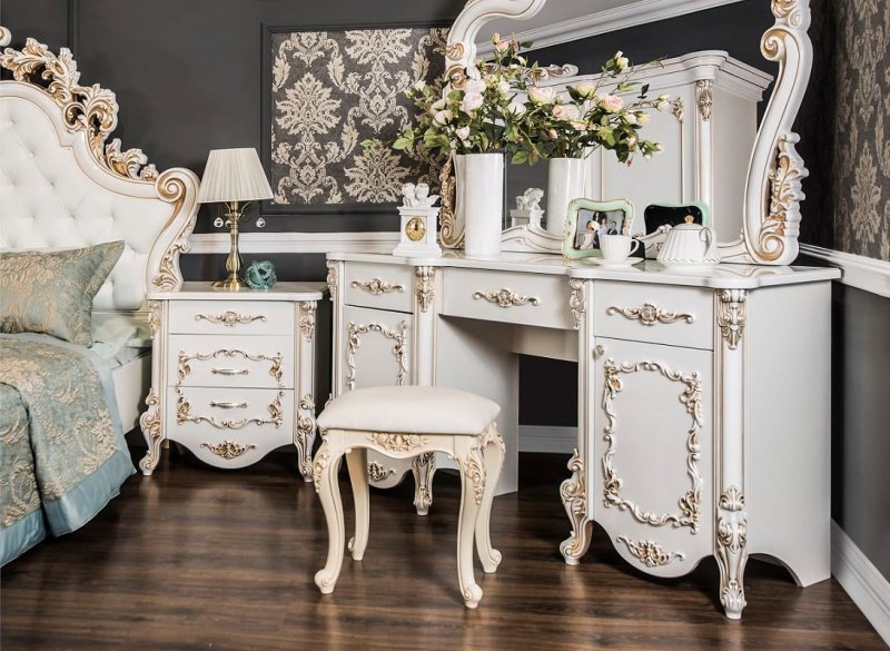 Ящики и дверцы украшены прочной фурнитурой, которая отличается длительным сроком эксплуатации. Фасады мебели украшены изящной резьбой с золотистым покрытием — такой симбиоз выглядит элегантно.