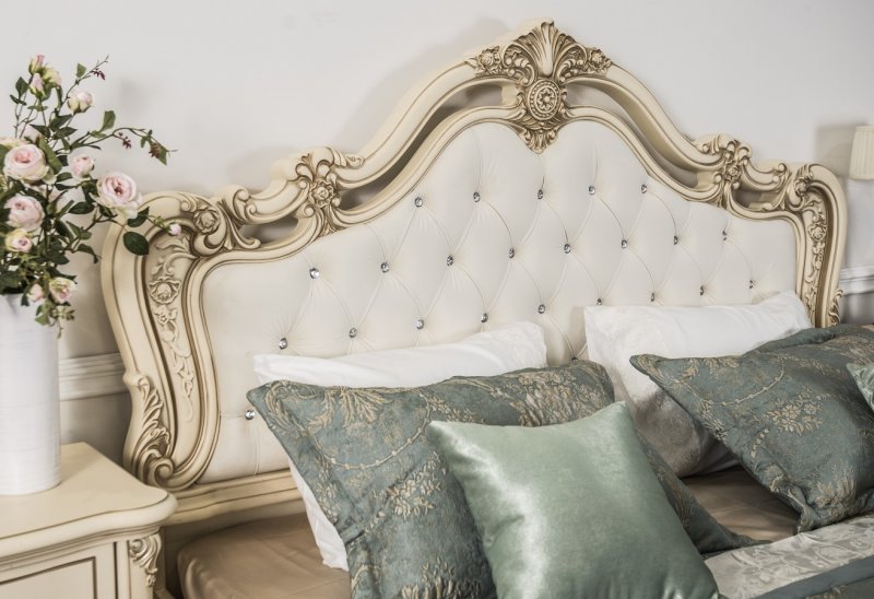 Возможен выбор и кровати с мягким велюровым изголовьем с кристаллами в каретной стяжке.