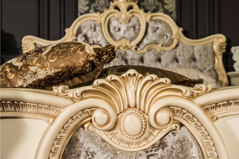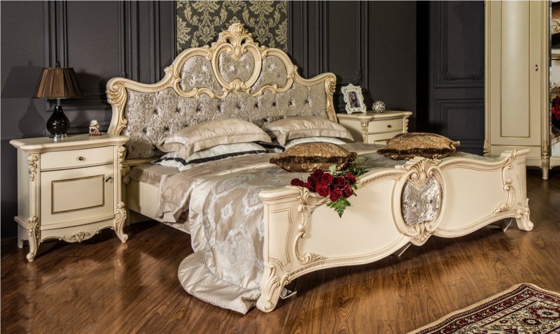 Спальня «Лорена» выполнена в классическом кремовом цвете или дерева-орех (караваджо). Кровать изящна, изголовье кровати обито тканью с бархатистым эффектом, выполнена в классических орнаментах, изножье украшено вставкой из шелкографии.