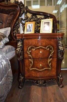 Кровать с роскошным мягким изголовьем из велюра украшена россыпью страз, Объемные декоративные элементы — лепнины, декоративные профиля на фасадах, карнизы и багеты увенчанные короной, колонны с капителями - в сочетании с патиной выглядят очень эффектно! Филигранный надставки на тумбы создают единую композицию с кроватью, а также могут украсить тумбу ТВ гостиной Джоконда