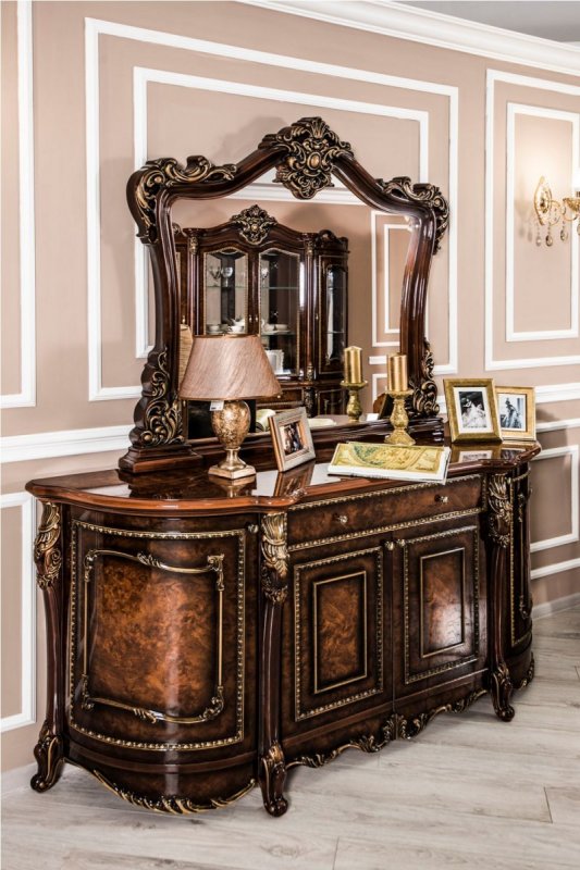 Обилие элементов и качественная отделка создает неповторимый образ. Каждый предмет мебели достоин называться царским, эта мебель настоящий антиквариат