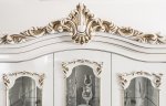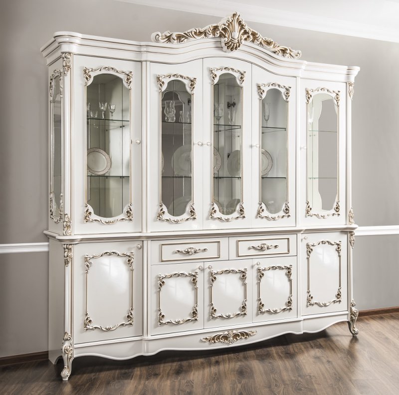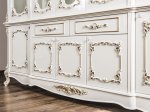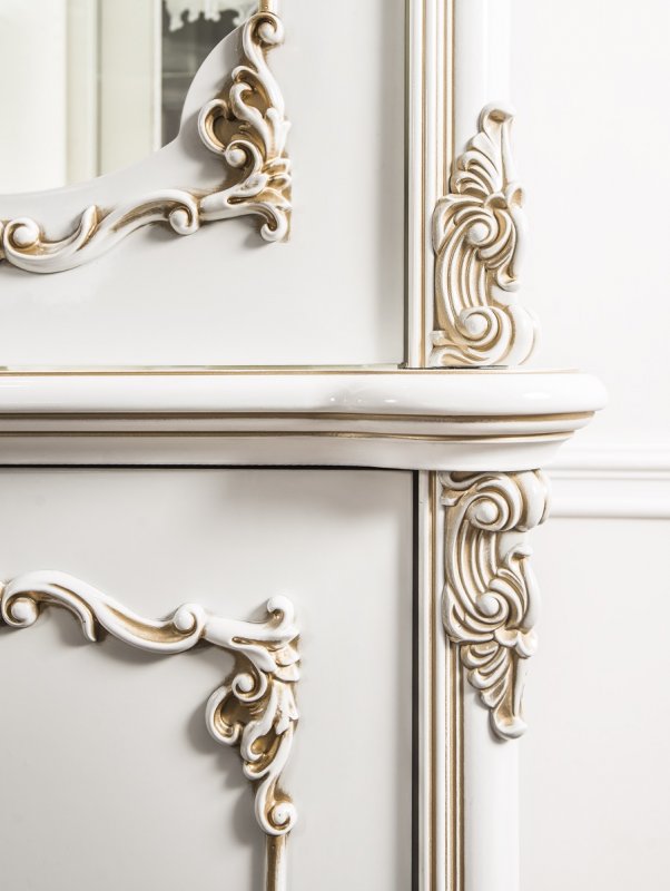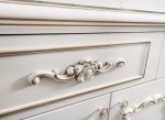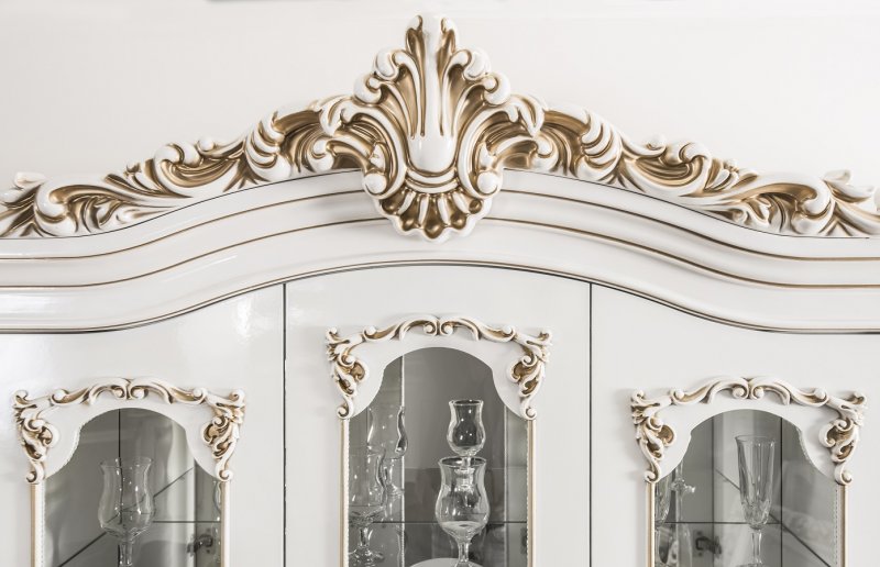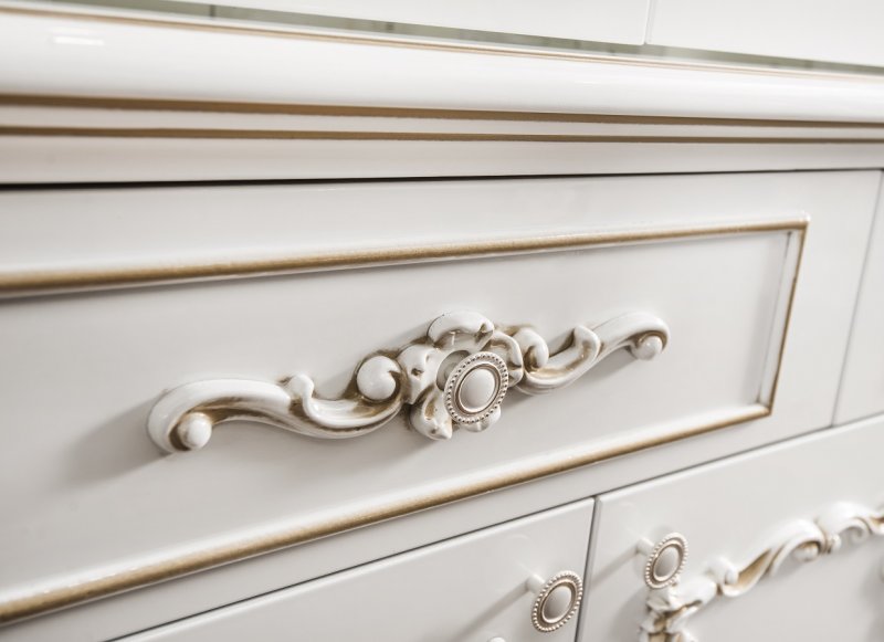Ящики и дверцы украшены прочной фурнитурой, которая отличается длительным сроком эксплуатации. Фасады мебели украшены изящной резьбой с золотистым покрытием — такой симбиоз выглядит элегантно.