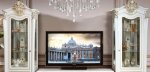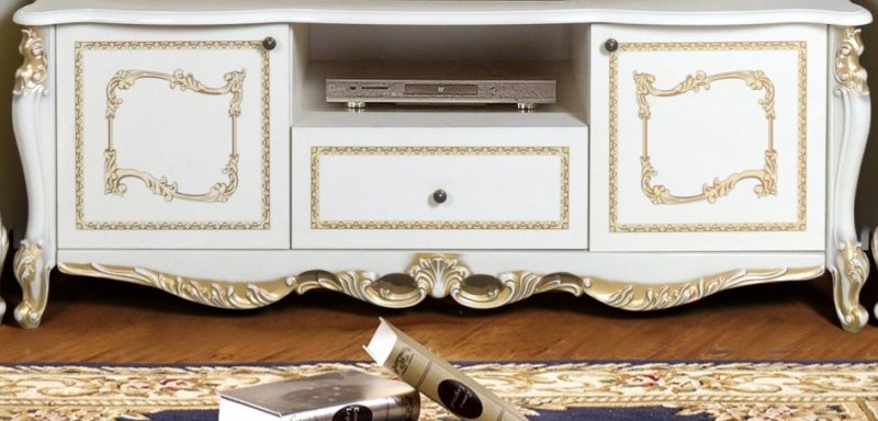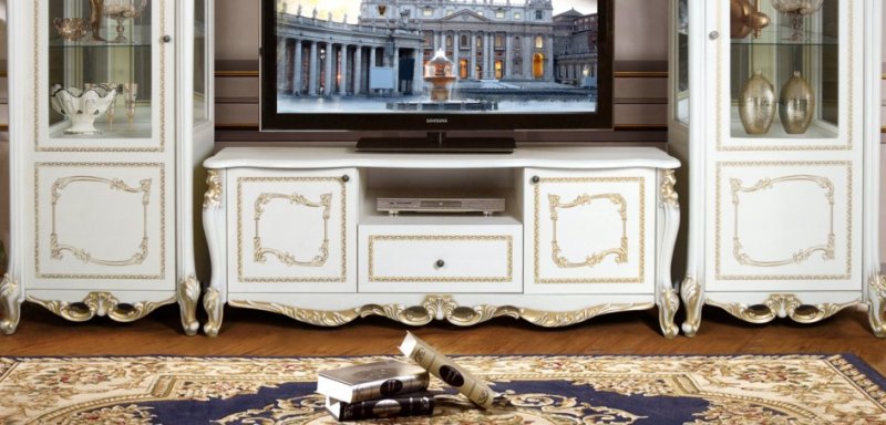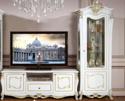 Джоконда - ТВ группа - изящный, воздушный дизайн, высокое качество исполнения. ТВ группа Джоконда подчеркнет Ваш утонченный вкус и станет прекрасным дополнением гостиной комнаты. Коллекция глянцевая. При декорировании применяется покрытие техникой «патина», ручная роспись и золочение В производстве использована ДСП 18 мм европейского стандарта Е 1 в фасадах и корпусах производства Swiss Krono Group, итальянская фурнитура, петли FGV, ручки Cosmov. Столешница ТВ тумбы выполнена из МДФ 22мм.