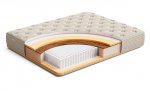 Матрас наполняют только натуральные материалы. Верхний слой сформирован комбинацией кокосовой койры и латекса, нижний – слоем латекса. Асимметричная жесткость позволяет подстраивать спальное место под свое самочувствие. Сон на стороне с кокосовой койрой будет комфортнее, когда на улице жарко. Сторона с латексом подходит для отдыха в прохладное время. Оба наполнителя хорошо пропускают воздух, не поглощают пыль и влагу.