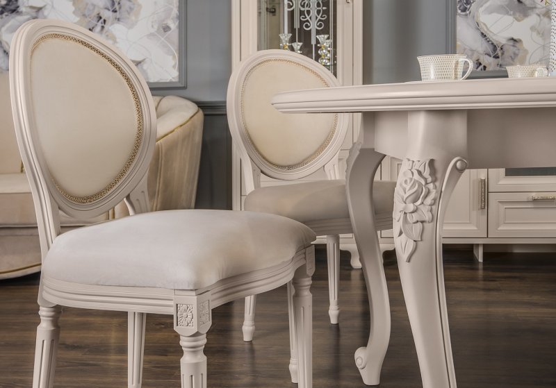 МОККО — это столовая группа с круглым столом и мягкими стульями на античных ножках.