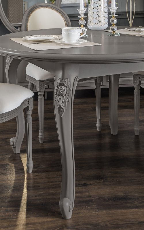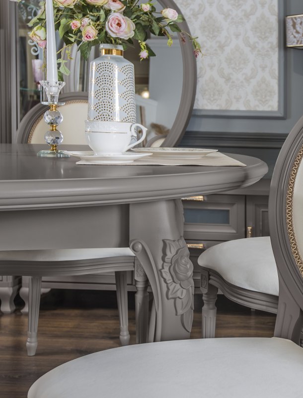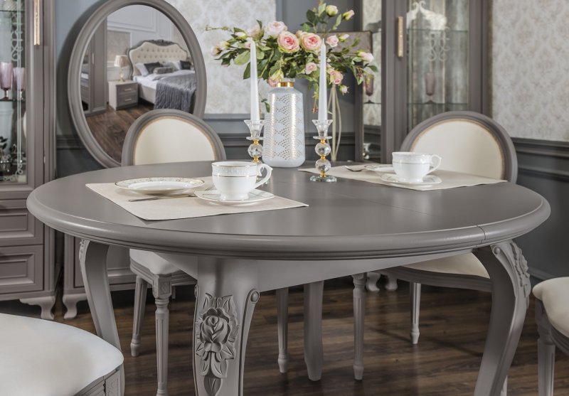 МОККО — это столовая группа с круглым столом и мягкими стульями на античных ножках.